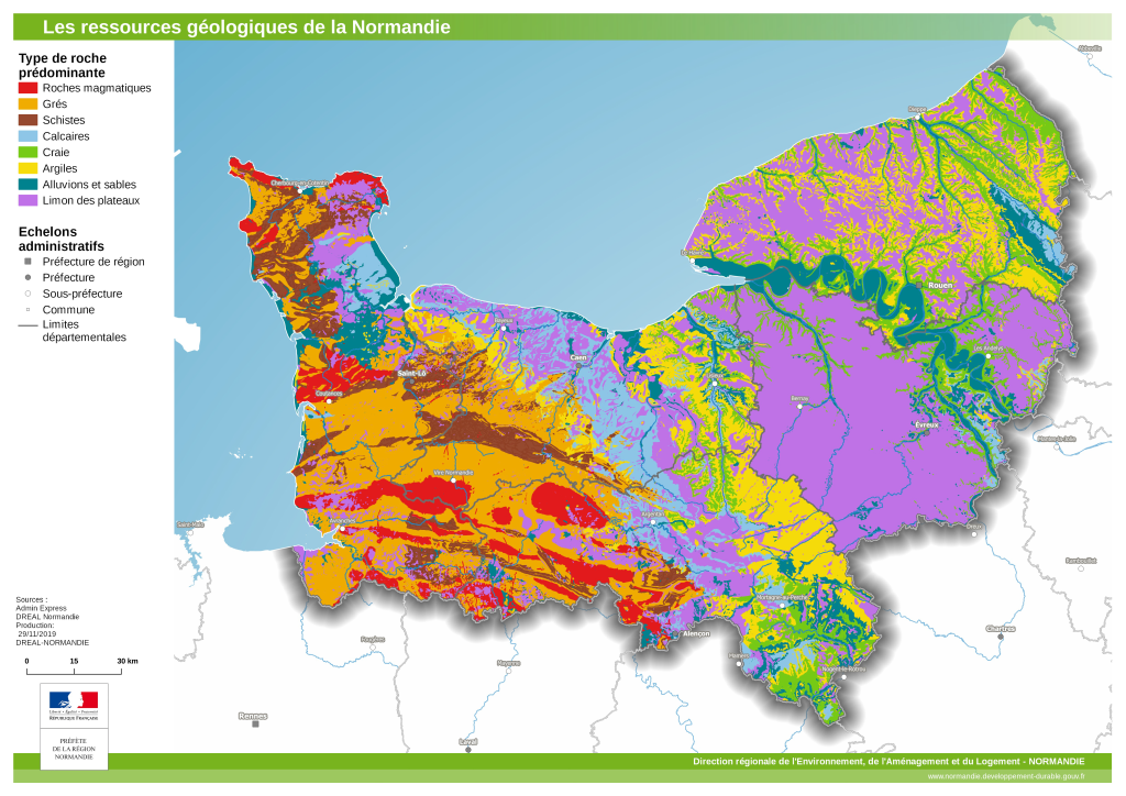 Carte géologique du territoire normand : la rencontre de deux régions biogéographiques. Les ressources géologiques de la Normandie. 2020